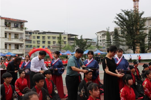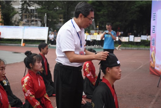 此次成人礼采用传统汉式形式。活动伊始,全体师生肃立,奏唱国歌,汉服社成员们身着盛装,带来精彩的汉服展。儒雅飘逸的汉服让人仿若穿越千年、梦回古代,伴随着悠扬高远的编钟雅乐,汉民族传统服饰的演进历程一一展现在眼前。300余名冠、笄者在徐宏、童以鸿、李富民、李萍、卢世蕾、罗玄的带领下走过成人门,在“德才兼备 知行合一”校训的鞭策下走向明礼知耻、崇德向善。冠礼、笄礼环节,正宾盥礼后,徐宏、童以鸿、李富民为冠者代表戴上成人礼帽,李萍、卢世蕾、罗玄为笄者代表插上及笄发簪,冠、笄者向师长行礼,用华夏汉民族的传统方式宣告自己长大成人,完成角色的转变。企业代表、师长代表为成人学子佩戴成人徽章,学子们在学校党委委员、团委书记、学生科科长郑术兵的带领下高举右拳,庄严地进行成人宣誓。校企合作委员会委员、内江市国兴咨询有限公司董事长官震表达了对学校搭建校园招聘平台的感谢,档案校作为全国唯一开办档案管理专业的职业院校,培养了一批又一批专业技能强、基础知识扎实、各方面表现都很优秀的行业人才,此次参加校园招聘会,一定严格按照国家用人规定,合理合规地履行相关手续,并承诺做到学生到岗实习期间同工同酬,切实保障学生的合法权益。