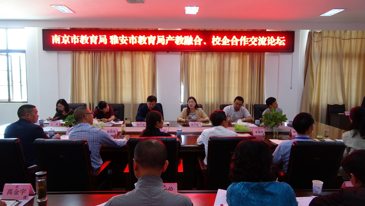 4月23日,由南京市教育局、雅安市教育局共同举办的产教融合、校企合作交流论坛在我校成功举办。雅安市教育局机关党总支书记王英,南京市教育局职业教育与社会教育处处长黄子亮,南京市卫生高等职业技术学校校长张宁新,南京市莫愁中等专业学校校长朱国美,副校长陈军、王燕,四川省贸易学校党委书记、校长董福海、四川省档案学校党委书记、校长徐宏出席论坛会。