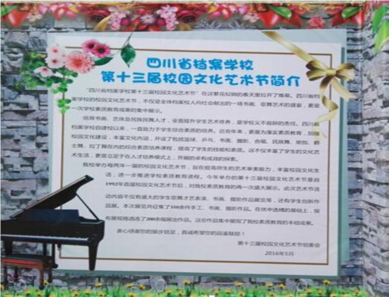 在这个绚丽多姿而又生机盎然的5月,我们共同迎来了期盼已久的四川省档案学校第十三届校园艺术节。两年一度的艺术节已经成为了校园一道亮丽的风景线,也成为了师生们心仪的欢乐节日。5月30日,我校第十三届校园艺术节在学校大礼堂盛大开幕。