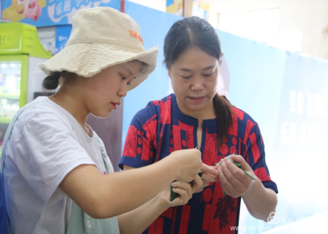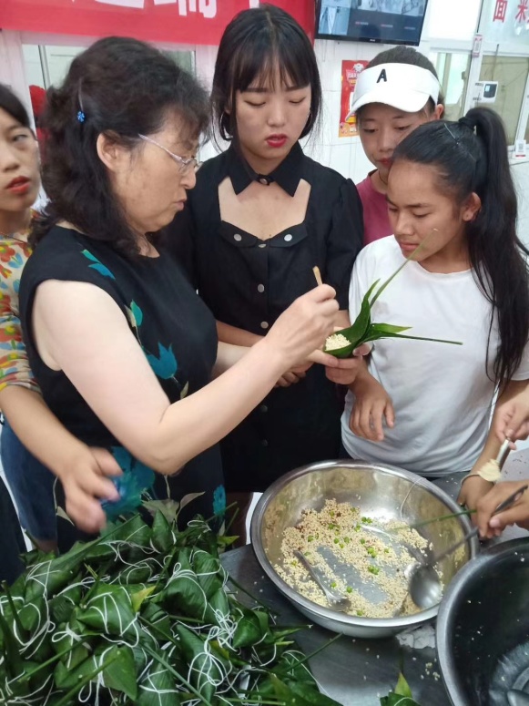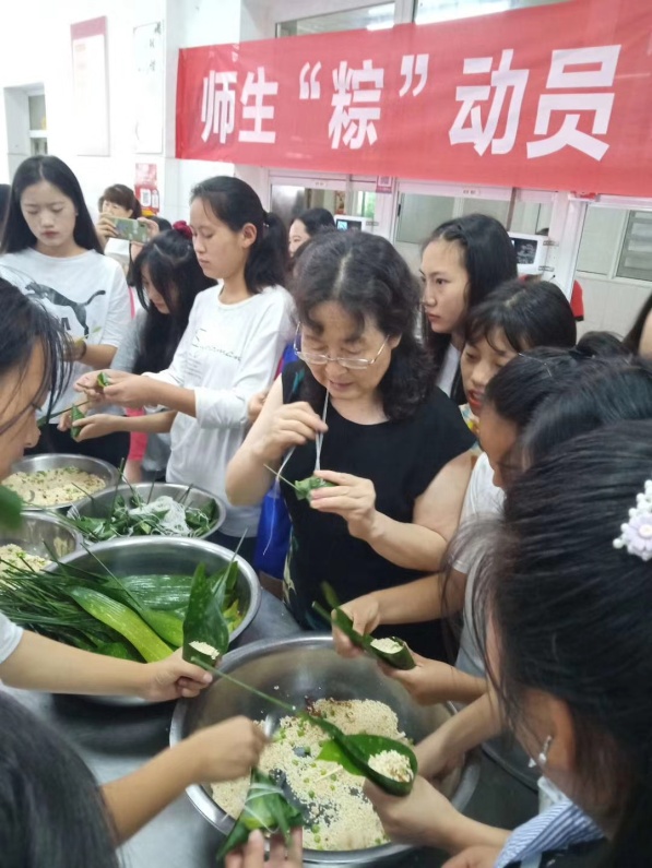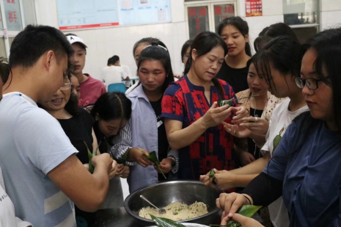 会包粽子的师生主动当起“师父”,不会的师生积极性也高涨,甘当弟子,虚心求教。