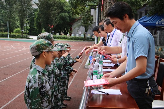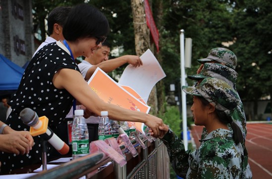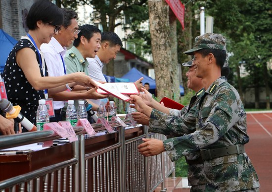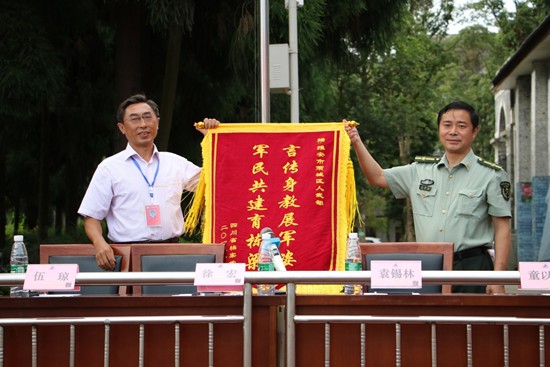 副校长童以鸿、 伍琼,学校党委副书记、纪委书记李富民分别宣读了2019级新生军训优秀标兵、优秀内务寝室、优秀方队及优秀教官名单并现场颁奖。最后,徐宏校长向雨城武人武部赠送锦旗并发表讲话。