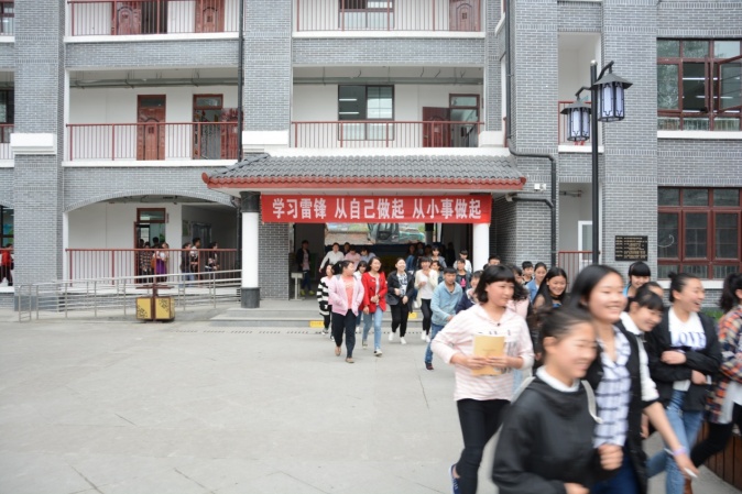 当日10:00整,随着地震警报声的响起,各任课教师立即停止授课,转而成为教室演练负责人,立即告知学生“地震来了,不要慌”,并指挥学生迅速抱头、闭眼,躲在各自的课桌旁,尽量蜷曲身体,降低身体重心,并尽可能用书本保护头部。2分钟警报声解除后,学生在教师的带领下,按照事先规定的疏散路线,安全、有序、
