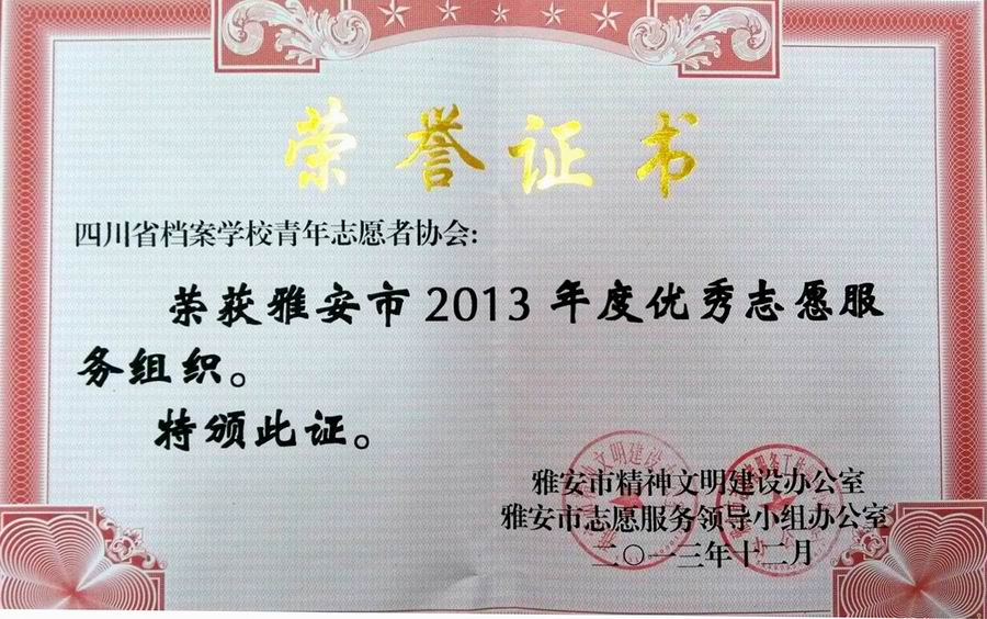 近日,由雅安市志愿服务领导小组办公室、雅安市精神文明建设办公室开展的雅安市2013年度优秀志愿服务组织评选表彰活动结果揭晓。我校青年志愿者协会荣获“雅安市2013年度优秀志愿服务组织”。