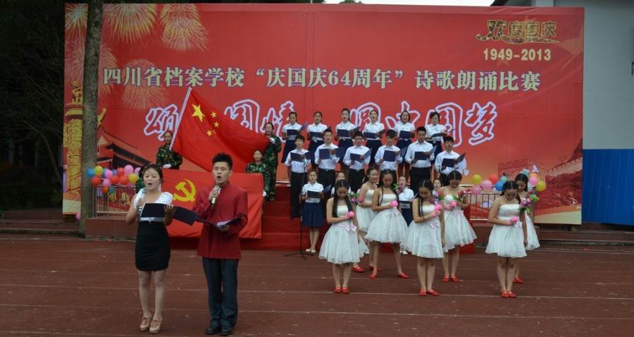 为了庆祝祖国六十四周年华诞,歌颂伟大的祖国和中国共产党,同时进一步激发同学们的爱国主义热情,弘扬伟大的民族精神,使同学们懂得珍惜今天幸福的生活,懂得感恩,发愤图强,2013年10月27日下午,四川省档案学校举行了以“颂祖国情圆中国梦”为主题的诗歌朗诵比赛。