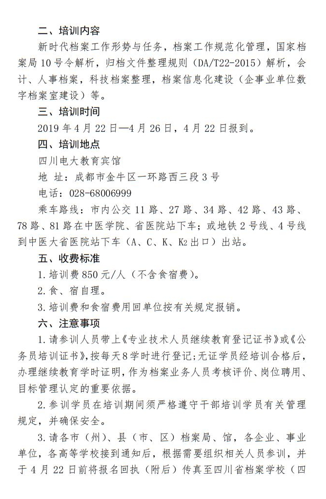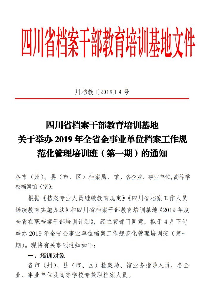四川省档案干部教育培训基地关于举办2019年全省企事业单位档案工作规范化管理培训班(第一期)的通知