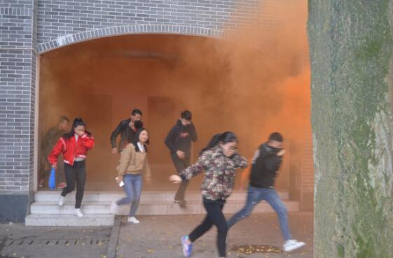 16时10分,消防应急疏散演练拉开了序幕,假设教学楼某处发生火灾危及学生的人身安全。为使演练逼真,保卫科在实训大楼和综合楼出口分别点燃了“演习专用燃气弹”,产生大量烟气。一时校内警铃大作,全体师生纷纷快速反应,用湿毛巾捂住口鼻、猫着腰,紧张有序地迅速冲出教学楼。在班主任老师的带领和指挥下,同学们按照事先设定的疏散路线迅速向塑胶球场集合,不到五钟,全校师生按演练方案依次紧急疏散,快速、安全地疏散集中到了学校操场。在操场集合后,保卫科立即要求各班班长清点本班人数,层层上报演练总指挥。经清点所有全校师生都安全的疏散到了指定位置,整个过程紧张规范有序,没有发生任何危险事故。学校保卫科长王三刚对本次演练做了总结,要求全校师生都要树立消防安全意识,掌握火场逃生技能,并对演练过程中个别不认真对待的同学提出了批评。随后保卫科科长王三刚宣布演练结束。