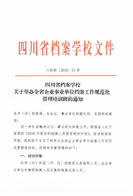 四川省档案学校关于举办全省企业事业单位档案工作规范化管理培训班的通知