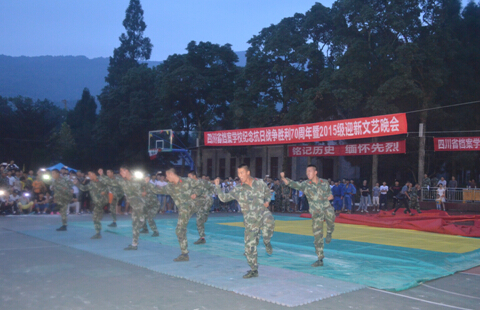 20159319:00,我校纪念抗日战争胜利70周年暨2015级迎新文艺晚会在校塑胶操场举行,校党委委员、学生科科长王三刚、学生科副科长黄宗珍参加了文艺晚会、雅安市武警支队全体承训教官及全体参训学生共计1000余人共同观看了演出。