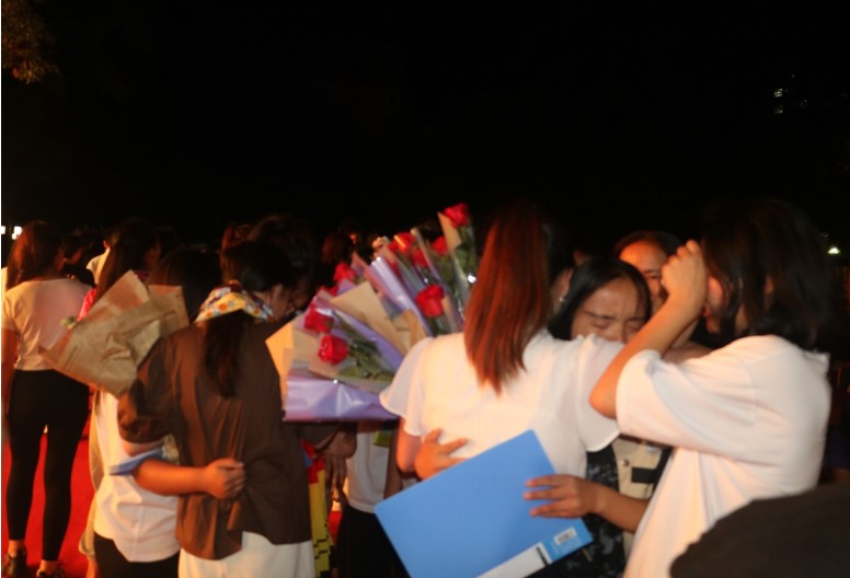 2019级全体班主任老师带来的诗朗诵《孩子,我想对你说》,温馨难忘,为此次离校典礼画上了圆满的句号。听着老师们饱含真情挚感的朗诵、细细叮咛的话语,蕴藏在内心深处的点滴回忆涌上心头,不少同学都红了眼眶。朗诵结束,同学们抱着早已准备好的鲜花纷纷上台拥抱老师,依依惜别。