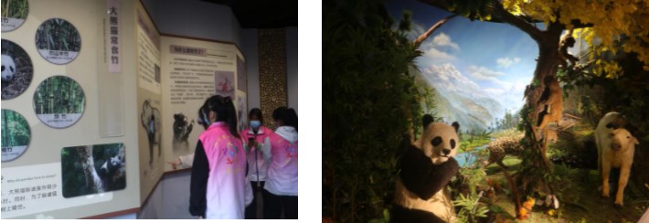 参观第三站,同学们来到了基地的另一个地方“大熊猫起源馆”。大熊猫起源馆是为宣传大熊猫文化、开展大熊猫科普教育工作而设立的专题展馆,馆内陈列分为大熊猫物种探秘、科学发现、和平使者、国家公园四个板块,向参观者揭秘大熊猫的前世今生,回放大熊猫的科学发现过程,讲述宝兴在保护大熊猫中作出的贡献及建设大熊猫国家公园的意义。这里有沉浸式的各种动物野外栖息地场景复原,还能看到大熊猫的伴生动物标本,身临其境地走进大熊猫野外生活的世界。