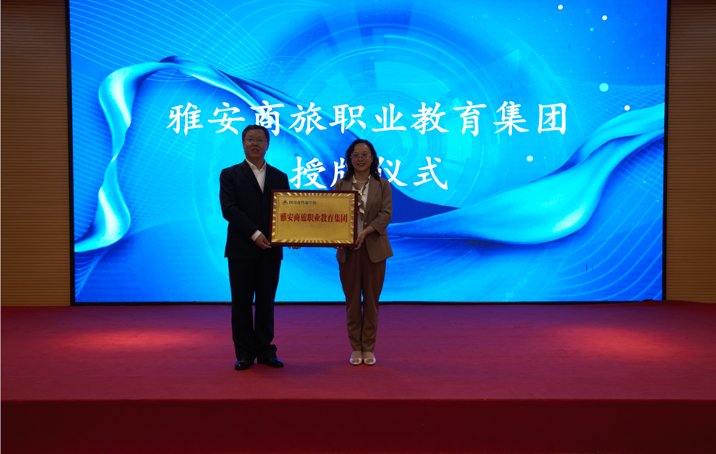 会上,许江涛为学校牵头成立的雅安商旅职业教育集团授牌。